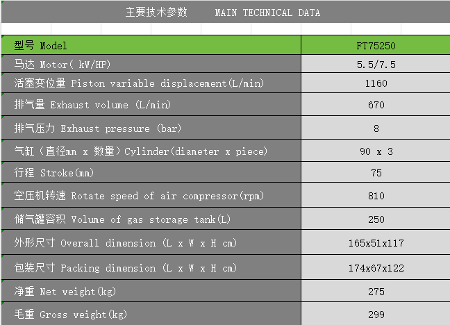 Product name:5.5KW 8bar FT75250 piston air compressor
